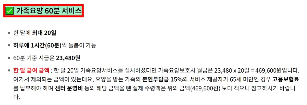 가족요양보호사의 급여는 본인 부담금 15%와 고용보험 등을 공제한 금액으로 지급됩니다. 예를 들어, 60분 돌봄 기준으로 한 달 동안 20일을 근무하면 약 46만 원 정도를 받게 됩니다. 90분 돌봄 기준으로 한 달에 31일까지 근무하면 약 98만 원 정도의 급여를 받을 수 있습니다.